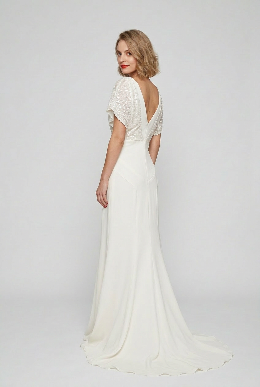 The Annie dress is one for the dance floor. With its loose sequinned sleeves, high cut waist and fitted skirt this dress was made to sashay! A simple shape with a touch of sparkle. This dress fastens at the back with a simple concealed zip.