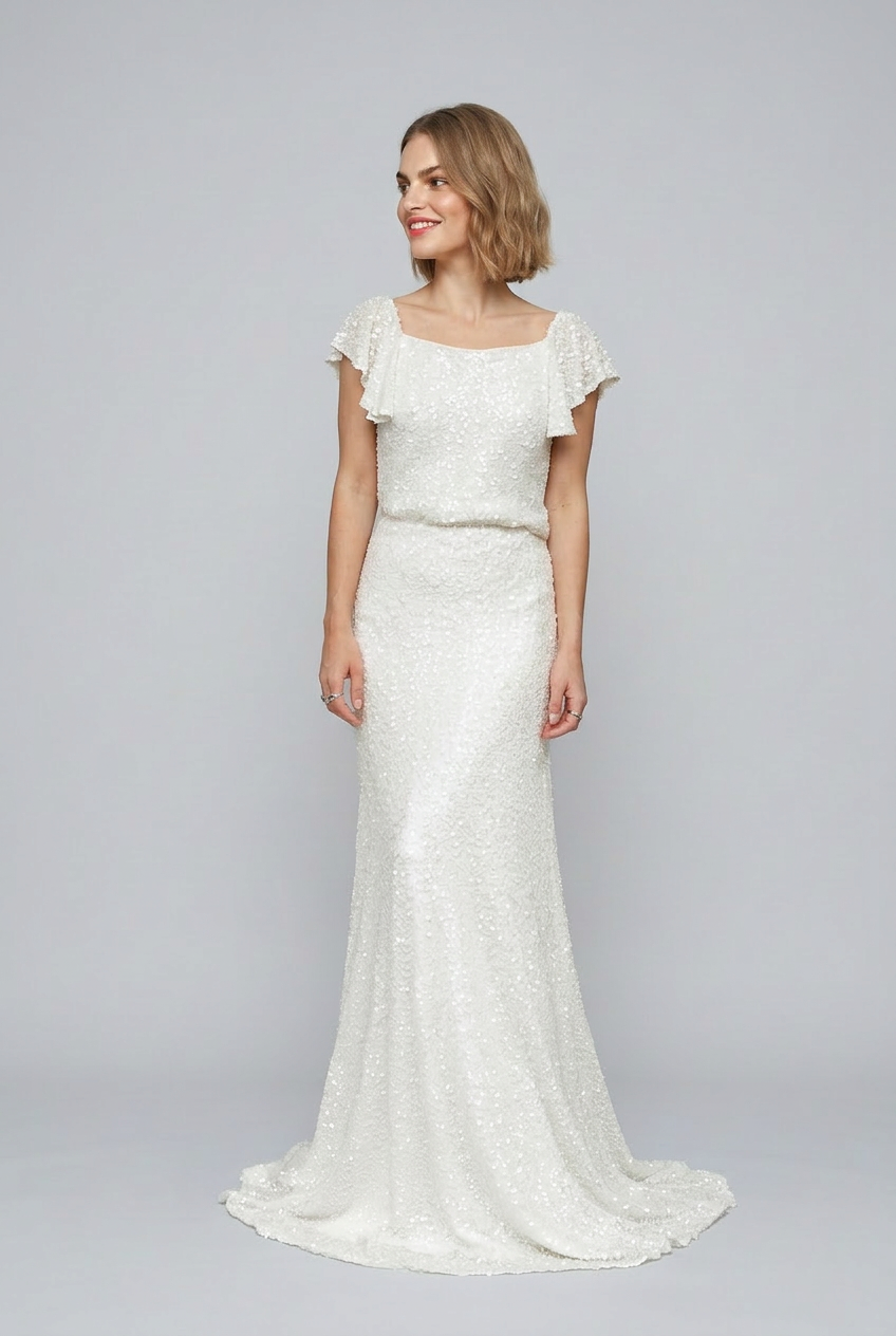 The Bonnie top and Bonnie skirt really set the tone of a ‘party wedding’. If you’re a bride that is looking for something more ‘party’ less ‘traditional’ this is a great choice. Both pieces are fully hand beaded and the sequins have a lovely watery shimmer to them. Bridal separates are also a great choice if your would like to wear your pieces again after your big day.