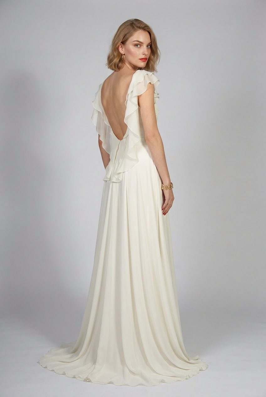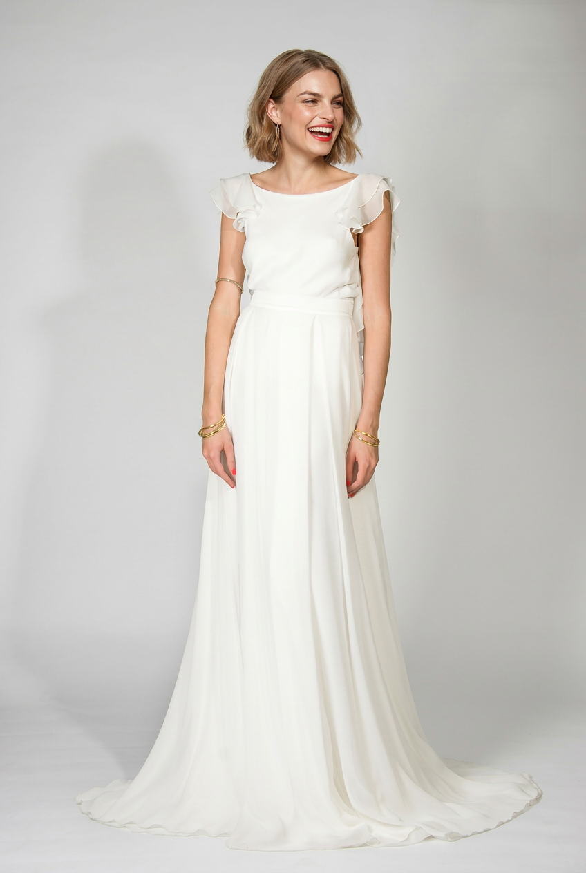 The Brooke top is beautifully angelic with its chiffon wings and loose bodice. This is a beautiful piece that all our brides end up wearing again and again after their wedding day. Whether for a wedding, an anniversary or a special night out, the Brooke top makes a stunning statement. The Scarlett skirt is made up of layers of silk chiffon with its high waist and delicate pleats its the perfect partner to the Brooke top.
