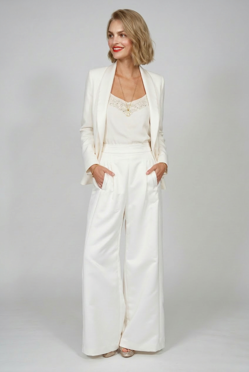 The Clover suit is sophisticated and chic. Creating a bold statement with bags of style. The gorgeous tailored jacket and wide leg trouser feel great to wear and you will enjoy them for years to come.