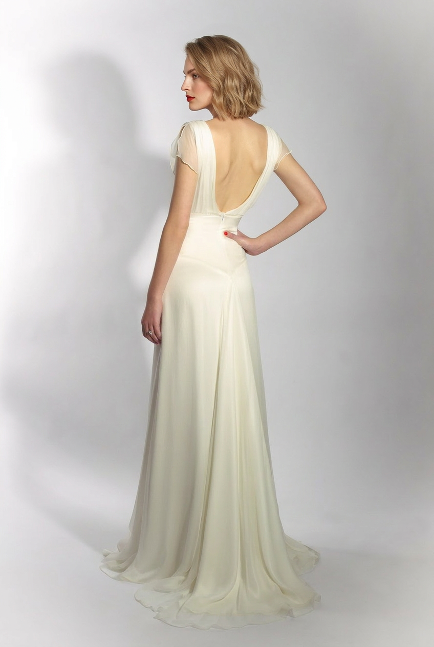 The Chiffon Belle dress exudes femininity with its three layers of the softest silks. The blouson chiffon top is so flattering on all bust shapes. The skirt has two godet panels at the front and one at the back which makes it dramatically sashays as you walk. This dress fastens at the back with a simple concealed zip.