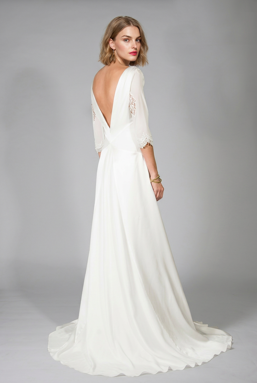 The Maisy dress with is clean lines is pure class. If you are looking for elegant simplicity for your dress, this is it. This dress is equally popular with and without the sleeves. The loose Aline skirt skims your hips and billows out at the floor. This dress fastens at the back with a simple concealed zip and can be covered with silk buttons depending on your style.