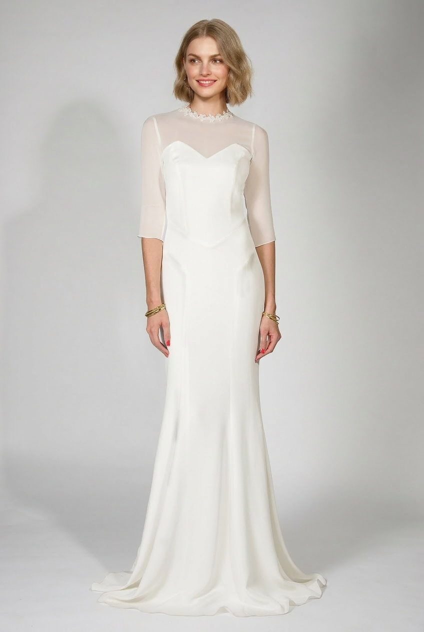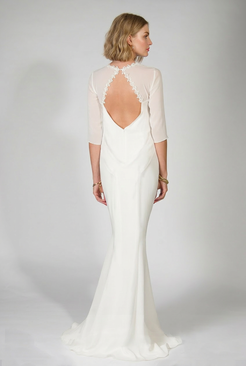 The Dusty is a timeless wedding dress. With its fitted silhouette, chiffon sleeves and delicate beadwork this look is chic and elegant. The beautiful beadwork circles the neckline and decorates the open back to give a really elegant finishing touch.