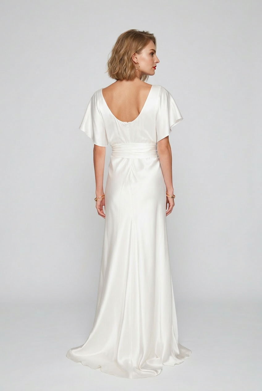 Our silk satin Luna dress is beautifully elegant. The simplest dress in our collection and cut to flatter every figure. The lightweight sleeves flutter beautifully while the adjustable wide sash cinches at the waist. The bias cut skirt flows down to create a beautiful shape which is gorgeously comfy to wear.