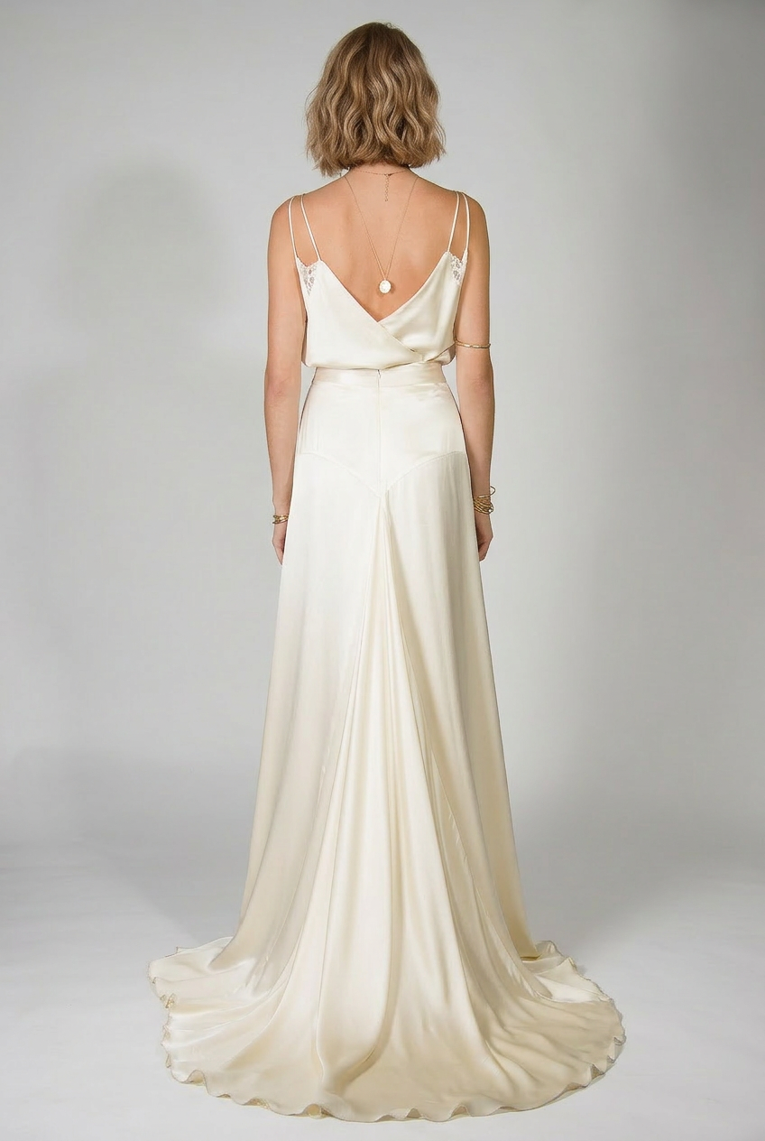 The Pearl cami is a really delicate & sassy top with its thin cross over straps and lace inserts. It wraps over at the back to create a beautiful plunging V which can be altered accordingly to where a strapless bra sits. The Belle skirt is high waisted and has three large godet inserts that really add volume to the hem and make it a perfect sashaying skirt.